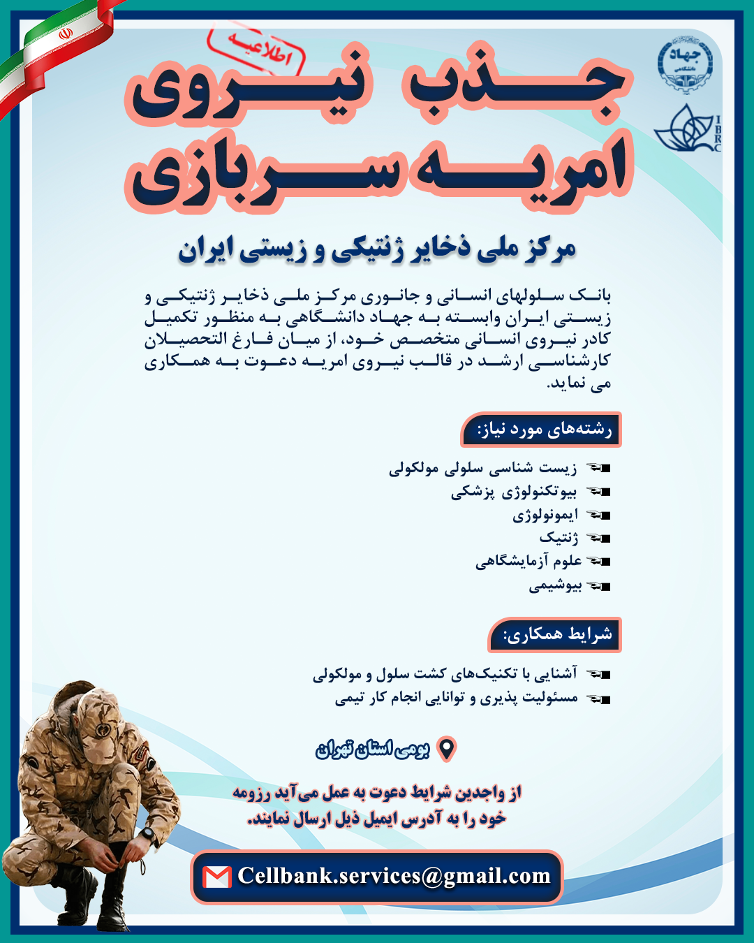 بانک سلولهای انسانی و جانوری مرکز ملی ذخایر ژنتیکی و زیستی ایران وابسته به جهاد دانشگاهی به منظور تکمیل کادر نیرویی انسانی متخصص خود، از میان فارغ التحصیلان کارشناسی ارشد در قالب نیروی امریه دعوت به همکاری می نماید.