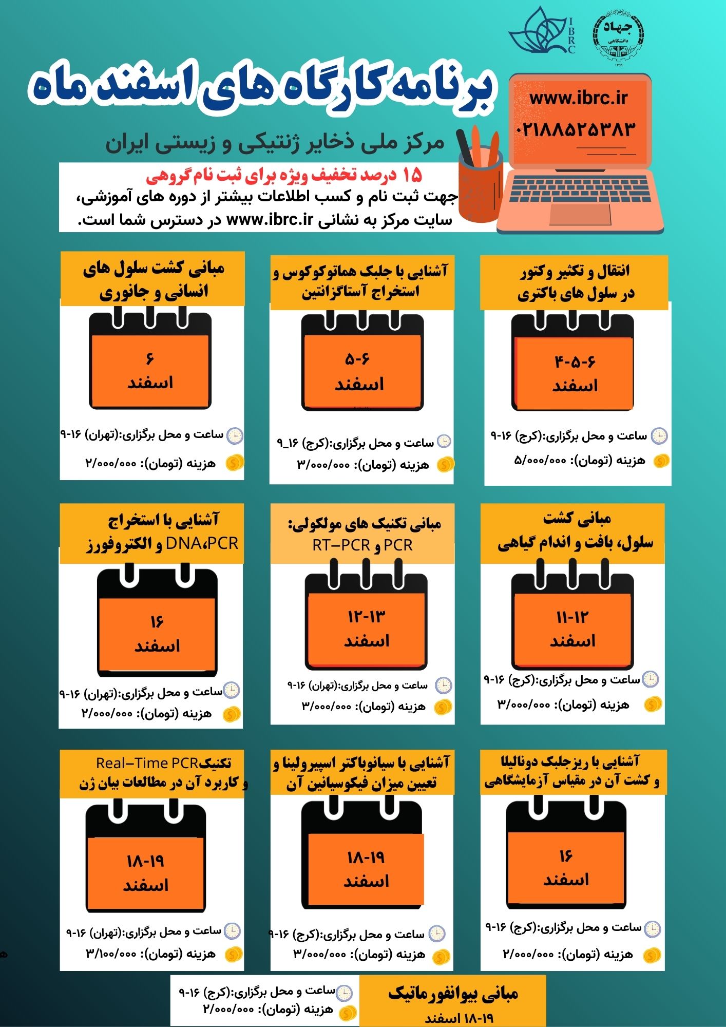 برنامه کارگاه های اسفند ماه 1404 مرکز ملی ذخایر ژنتیکی و زیستی ایران