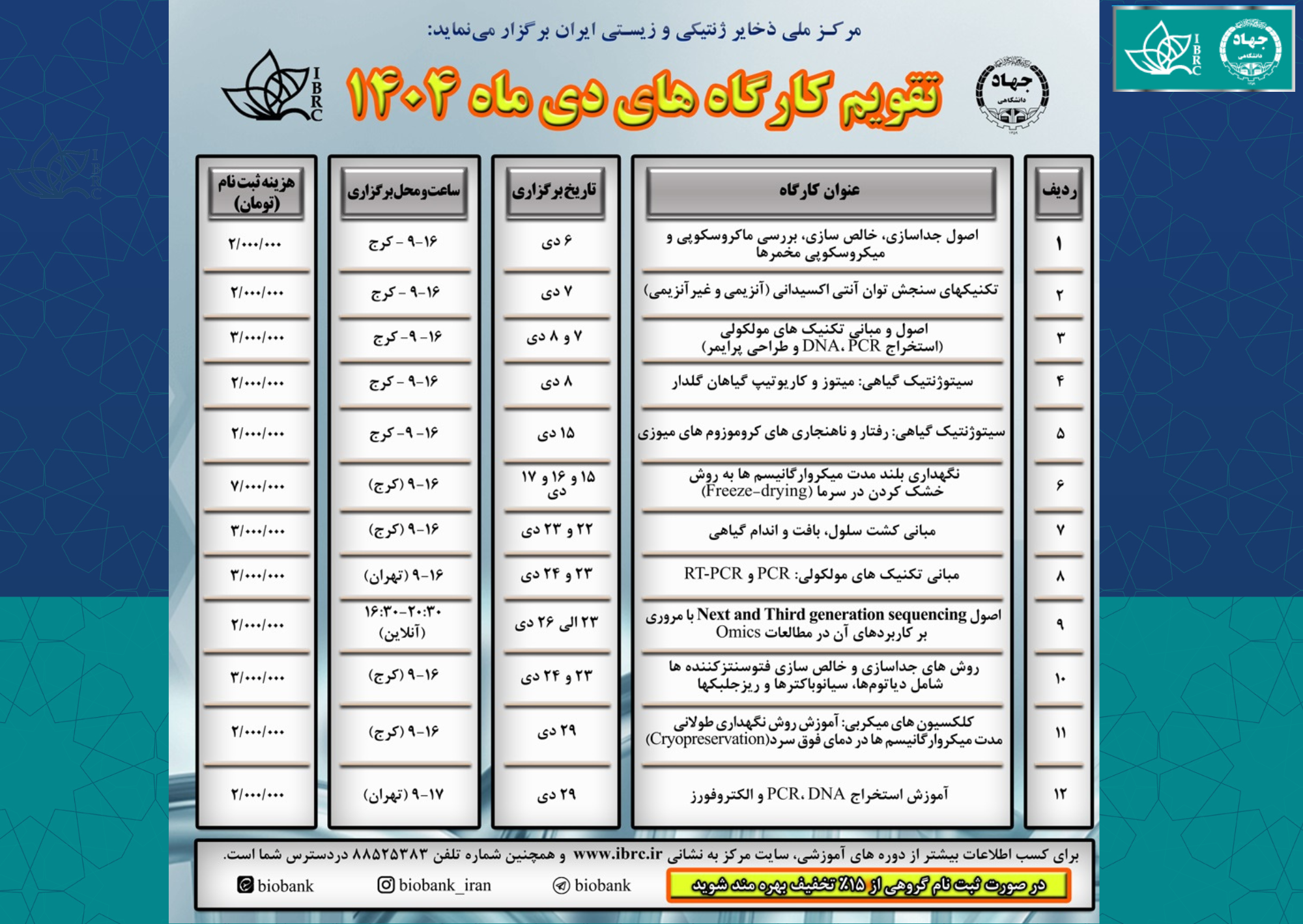 تقویم کارگاههای آموزشی دیماه ۱۴۰۴ مرکز ملی ذخایر ژنتیکی و زیستی ایران