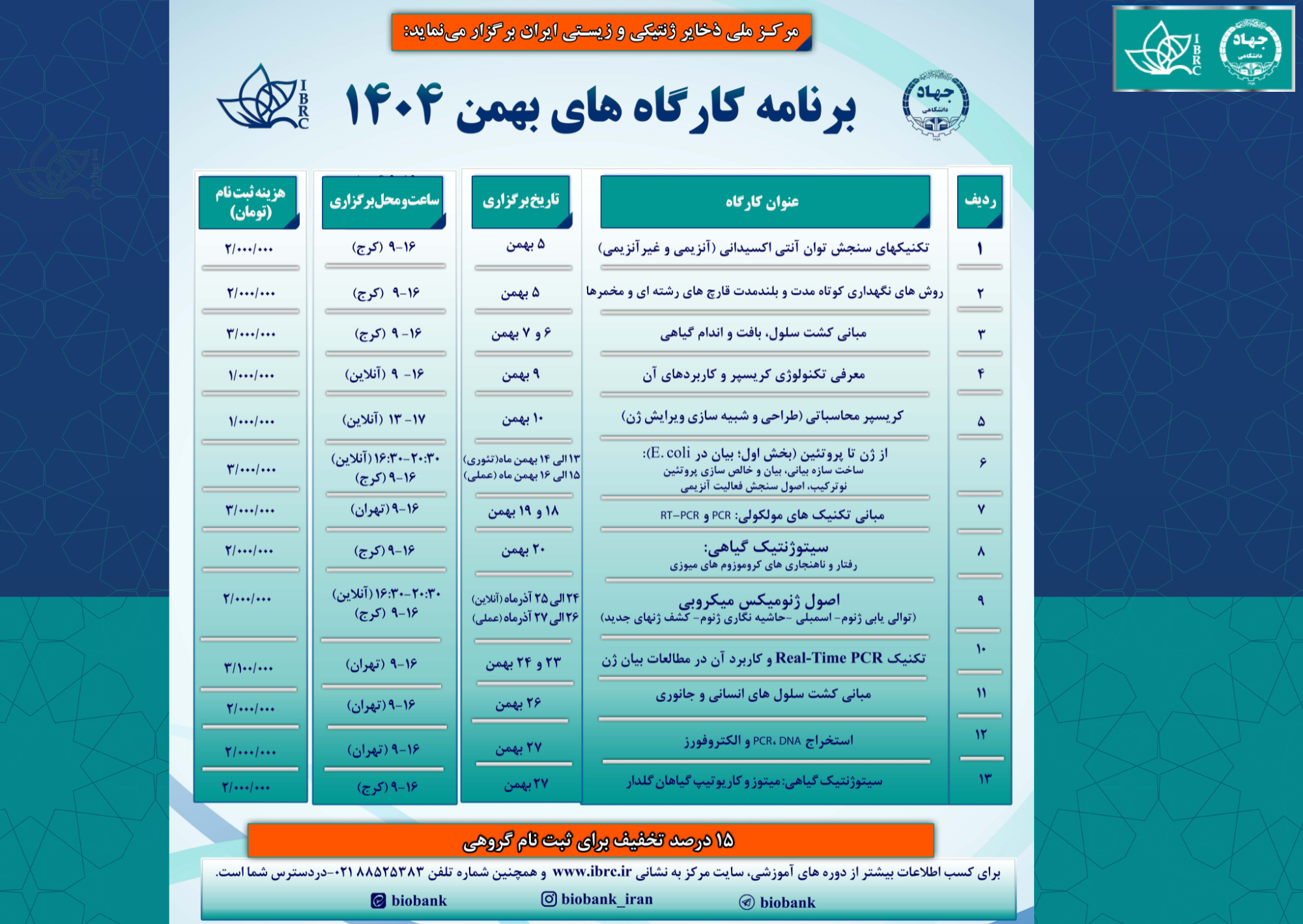 جهت کسب اطلاعات بیشتر درباره سرفصلها، زمان برگزاری و نحوه ثبتنام، به وبسایت مرکز ملی ذخایر ژنتیکی و زیستی ایران به نشانی www.ibrc.ir مراجعه کرده یا با شماره تلفن ۸۸۵۲۳۸۳۳ تماس حاصل نمایید.